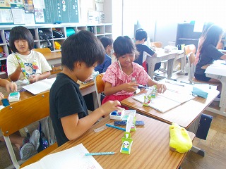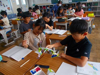 鉛筆と定規どちらが重いかを予想して調べる学習をしました。教科書の巻末についている付録で天秤を作り、おはじき何個分の重さかを調べて比べることにしました。隣り同士で天秤を持つ人とおはじきを一つずつ増やしていく人と分担をして協力して調べます。定規や鉛筆とつりあったら、二人でおはじき何個分だったかを数えて確かめていました。天秤を作ったり実験をしたりという活動中心の学習はとても楽しそうでした。