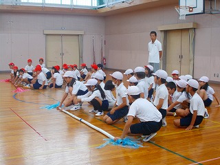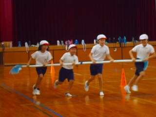 体育館で、3・4年生が「八輪小ハリケーン」の練習をしていました。先週の練習に比べてずっと上手になっていました。チームで棒の中心や端をもつ人を相談して変えたことや棒を速く上下にくぐらせるために「立って」「座って」など声をかけ合って協力していることに驚きました。チームワークが勝敗の鍵をにぎることに気づき、一致団結している姿がすばらしかったです。