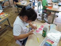 今日は、箱や缶、積み木の面を写し取り、面の特徴を利用した絵を描くことを通して、平面図形に親しむ学習をしました。丸からトマトやリンゴを描いたり、三角からイチゴを描いたりするなど発想豊かでした。