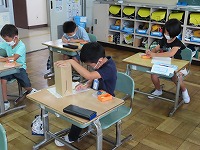 1年生は、算数で「いろいろなかたち」の勉強をしています。箱や缶など身近な立体を見て、似ているところを見つけて仲間分けしたり、特徴を理解したりしています。