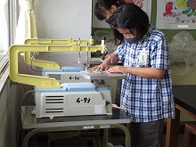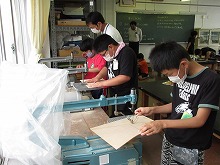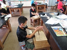 電動の糸のこぎりを使って、デザインした線にあわせて慎重に板を切っていきます。最終的には、色を塗ってひもを通して、伝言板となります。きっと、楽しい伝言板ができることでしょう。