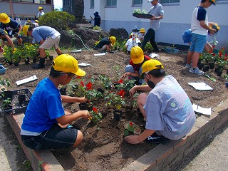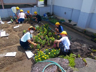 5・6年生がメイン花壇に苗の定植を行いました。苗の色ごとに植える場所が違うので苗を並べてから土を掘り、ポットを外して根元まで土をかぶせました。担当した場所ごとに班で協力して次々に植えていく様子は、さすが5・6年生だなと感心しました。5・6年生の皆さんのがんばりで、今年もメイン花壇は色とりどりの花がきれいに咲いています。