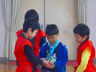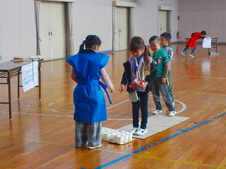 ハッピをきたお店屋さんの2年生はやる気満々、お客さんの1年生はワクワクドキドキで、「おもちゃランド」がスタートしました。おもちゃのもち方などコツを教えてあげたり、点数が入らなかった時に「もう1回いいよ」と言ってあげたりなど、2年生の優しい姿があちらこちらで見られました。色とりどりのメダルをいっぱいもらって、みんなで楽しく遊ぶことができて、1年生も大満足でした。