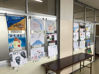 1年生は「たいせつボックス」の作品作りをしています。宝箱のデザインはそれぞれ個性があって素敵です。4年生の掲示は防災の学習をした時に「災害から命を守る」をテーマにポスターを描いたものです。学習したことが活かされています。