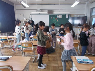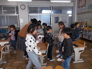 12月が近づいてくるということで黒板には、大きなサンタさんとクリスマスツリーの絵が登場しました。3枚の色の違う飾りカードをもって友達とじゃんけんをします。勝った人が「I like ~ 」と好きな色をいってカードをもらい、負けた人に違うカードを渡します。3枚同じ色のカードがそろったら黒板のクリスマスツリーに飾りをはることができます。クリスマスソングの流れる中、好きな色を集めようと張り切ってじゃんけんをして、楽しみながら色の名前を覚えることができました。