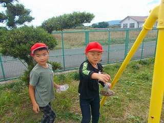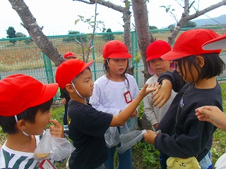 今日は、おめんにつける葉っぱや実を集めるために校庭に秋さがしに出かけました。黄色くなったイチョウの葉や茶色の落ち葉を集めながら、「あ、見つけた!」「先生見て!」「さわりたい人おいで!」とバッタやコオロギを見つけては大喜びしていました。校庭を一周する頃には、大小様々色とりどりの葉っぱが集まりました。