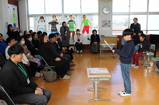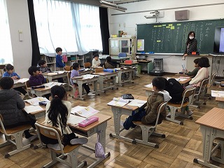 3年生は外国語活動で「What this?」の学習をしていました。隠れている動物探しです。擬態をしているので、なかなか難しかったようです。1年生は、運動場で、生活科で作った凧を上げていました。絡まることなく上手に凧が上がっていました。