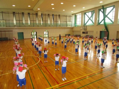 この時間は1、2年生のダンシング玉入れのダンスの練習でした。かわいく、かっこよく踊れるように、息をそろえて1、2、3、4!!