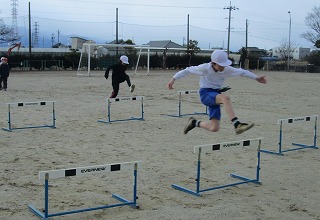 2月18日(火)の体育の授業でハードル走をしました。自分に合った高さや幅を選び速く走れるように練習を進めています。今日は初めてタイムも計りました。