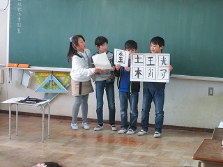 1月30日(木)の国語の時間に、音訓かるたをしました。前の時間に、同じ漢字の「音」と「訓」を使って五・七・五のリズムになる歌を作りました。それを使って、音訓かるたを作りました。個性あふれるかるたができました。