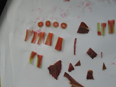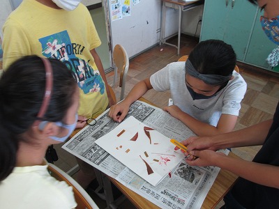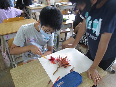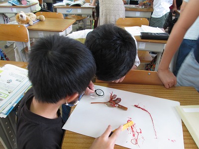 理科では、根からとり入れられた水は、植物のからだのどこを通って、全体に運ばれているのか調べました。ホウセンカを色水に入れ、それぞれの部分をカッターで切って、中のようすを観察しました。