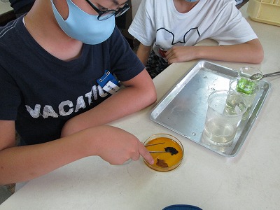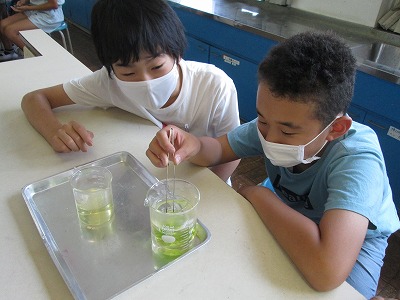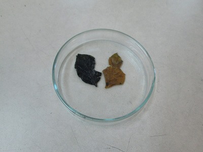 理科の時間には、植物の葉に日光が当たると、でんぷんができるのか実験をしました。ジャガイモの葉に前日に覆いを付けておき、朝に覆いをはずしたものと付けておいたものでは、でんぷんの量に変化があるかを調べました。日光が当たった葉には、でんぷんがあることを確認しました。