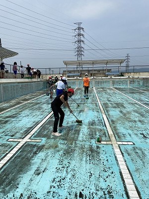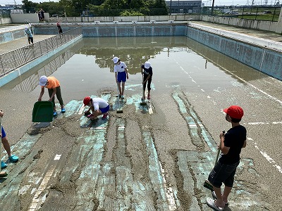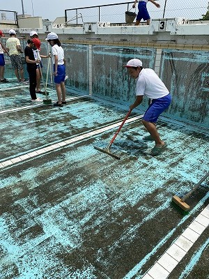 今年度、水泳の授業はありませんが、長期間そのままにしておくとプールが悪くなってしまうので、6年生と5年生でプールの清掃をしました。6年生は、プールの中の泥や汚れをブラシなどを使ってきれいにしました。最初は、「きたない」「くさい」と言っていましたが、慣れていくと機敏な動きでプールをピカピカにしてくれました。最後は、水遊び状態でしたが・・・とってもがんばっていました!!