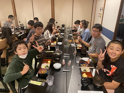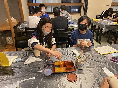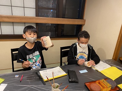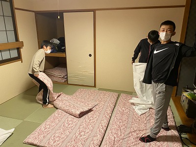 旅館では、湯呑の絵付け体験や友達との楽しい時間を過ごしていました。普段やらないであろう布団のシーツをかぶせるだけで大苦戦!かけ布団を敷布団にしている部屋も…