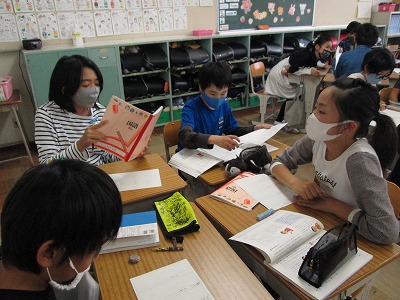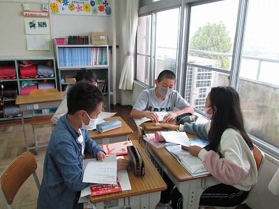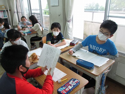国語では、グループで話題を決め、自分の考えをまとめた後に、賛成・反対の立場に分かれて話し合いを進めました。それぞれの意見に対して、疑問に思ったことや気づいたことなどを質問し合いました。話題は、「放課はすべて5分でよい」「学校は、ランドセルよりリュックのほうがよい」「学校では、教科書よりタブレットがよい」「給食よりも弁当のほうがよい」などグループで考えました。