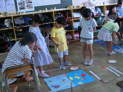 2年生が作ってくれた「おもちゃひろば」で、空気砲をしたり磁石で釣りをしたりして遊びました。おみやげももらって、楽しい時間を過ごしました。