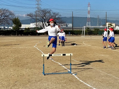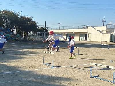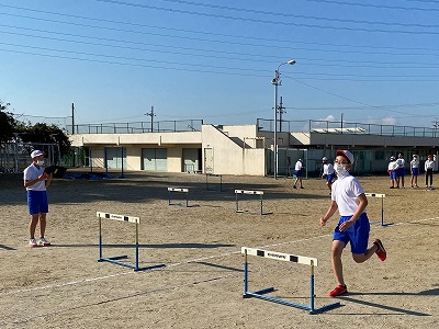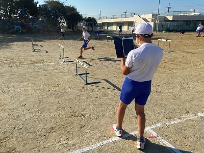 体育の授業では、ハードル走に取り組んでいます。自分に合う高さや間隔を決め、練習しています。上に高く跳びすぎるマリオジャンプにならないように重心を低くしたり、ハードルに近づきすぎないようにしたりしています。タブレットで自分の走りを撮り、どうしたらよいか次につなげていきます。