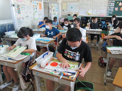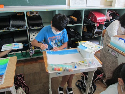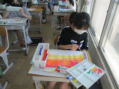 図画工作では、教科書の作品からどんな空なのか、どんな筆使いをしているのか、どんな色使いをしているのか考えました。その後、「自分の空」を描きました。色の濃淡をつけたり、筆の使い方を工夫したり、手やティッシュでやってみたりと、様々な方法で描いていました。それぞれの個性あふれる「空」が完成しました。