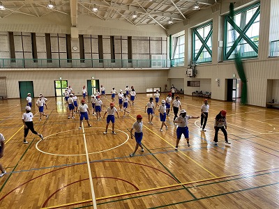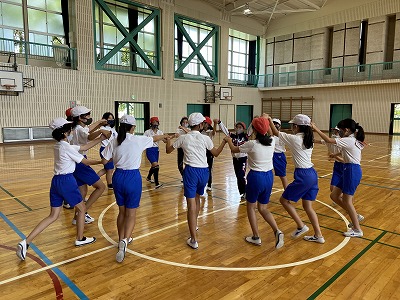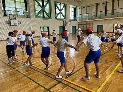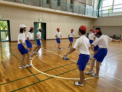 体育では、イスラエルの「マイムマイム」を踊りました。まず、基本の動きを全員で確認し、その後にグループに分かれて、動画を見ながら音楽に合わせて練習をしました。最後に、男子と女子に分かれ出来栄えを披露しました。「フォークを持って踊るの?」から始まったフォークダンスでしたが、徐々にそれらしい形になり、皆で楽しそうに踊っていました。