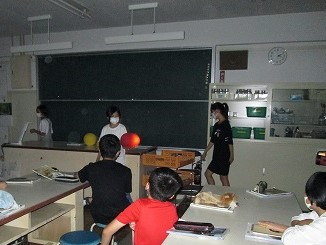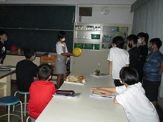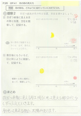 理科では、月の特徴を調べたり、月の形がどのように変わっていったりするのか調べました。家庭で月の表面の様子や日没直後の月の形と位置を観察したものを元に進めていきました。懐中電灯を太陽、ボールを月、観察する人を地球に見立て、ボールの明るく見える部分がどのように変わるか考えました。