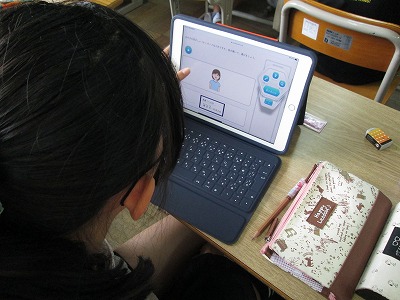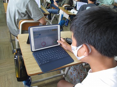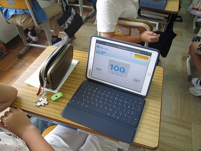 総合の時間には、タブレットでeライブラリーの使い方を行いました。自主学習ができるよう学年に合わせた問題があります。今日は、操作方法の確認と問題に練習問題に取り組みました。まずは、算数の約分のない簡単な分数のわり算の問題を全員でやりました。「1問間違えた!」「100点だった!」と楽しそうに学習に取り組んでいました。そのあとは、自分で学年と教科を選択し、問題に取り組んでいました。自分の結果が記録に残るので、自分の苦手なところを把握できます。