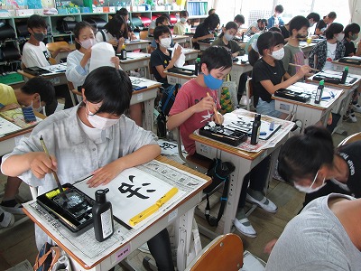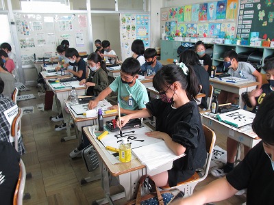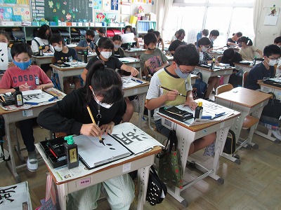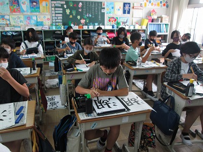 書写の時間では、「湖」の練習が始まりました。「古」と「月」が離れすぎないように気を付けて書いていました。肘の位置にも気を付けながら、練習しました。
