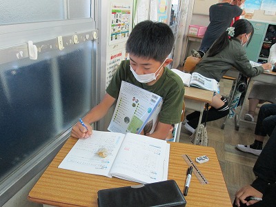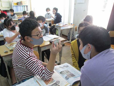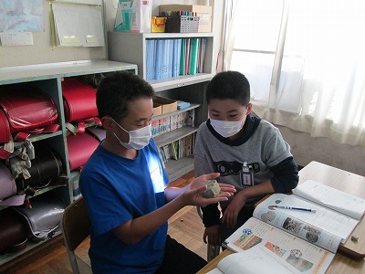 理科の時間では、「水のはたらきでできた地層の特徴」と「火山灰でできた地層の特徴」について学習しました。水のはたらきでできた地層の岩石を実際に見てノートにまとめました。