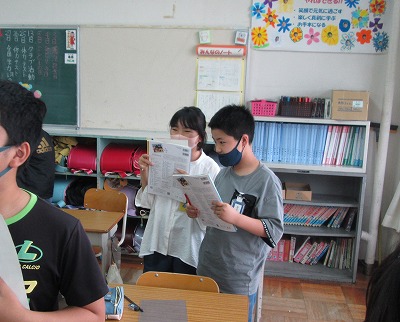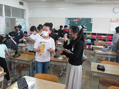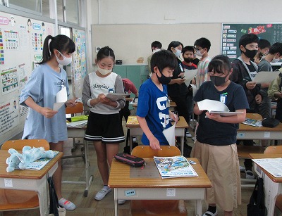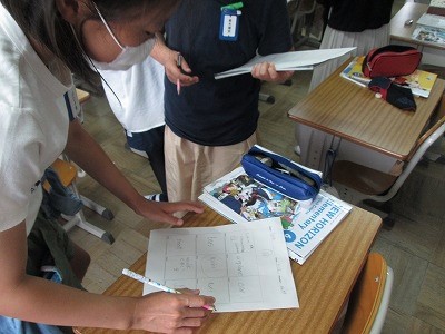 外国語の時間には、住んでいる場所・通っている学校・どうやって学校に行くのかを英語で言えるように練習をしました。今日は、その3つを使ってインタビュービンゴをしました。