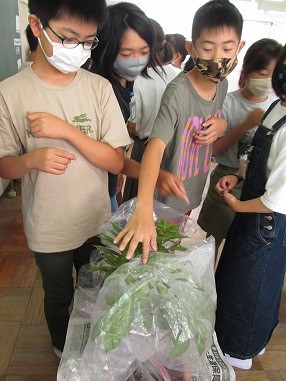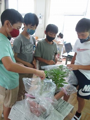 理科の時間には、葉まで運ばれた水は、その後、どうなるのか調べました。葉のついたホウセンカと葉をとったホウセンカに袋をかぶせ、10~20分たってから袋の中の様子を観察しました。葉のついたホウセンカは袋がくもり、水滴がついていました。