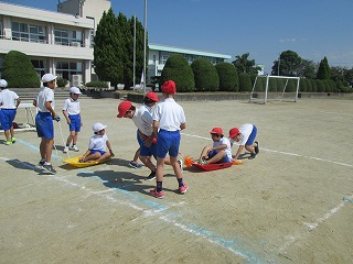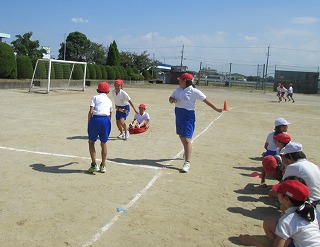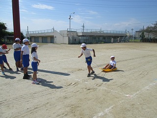 9月26日(木)に、運動会に向けて3・5年生の最後の練習を行いました。3年生は、5年生にソリに乗せてもらってとても楽しそうです!5年生は・・・頑張ってくれています。