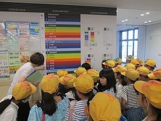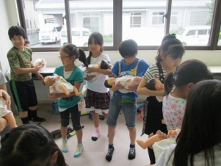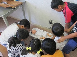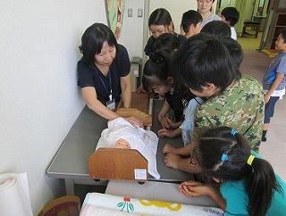 佐屋保健センターでは、施設を案内してもらったり、赤ちゃんの身長や体重の測り方を教えてもらい、人形を抱っこさせてもらったりしました。