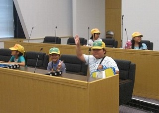 市役所では、それぞれの階に何があるのか説明を聞きました。みんな真剣にメモをとっていました。最後には、議会をする場所に入れてもらい、お話を聞いたり、質問をしたりしました。