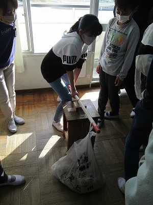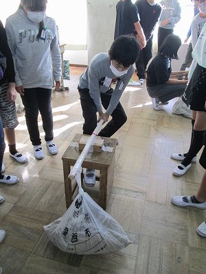 理科では、てこを使ってできるだけ小さい力で重いものを持ち上げるにはどうしたらよいかを考えました。実際にてこを使っておもりを持ち上げ、手ごたえを調べました。