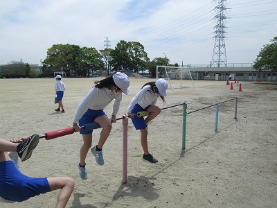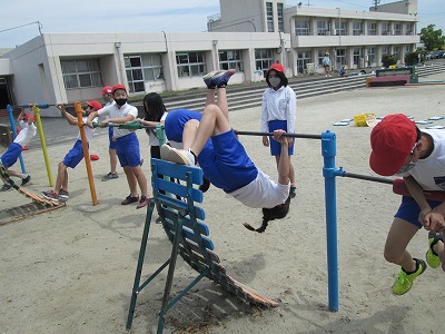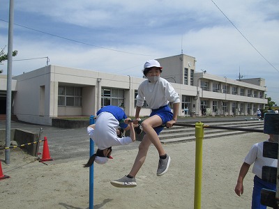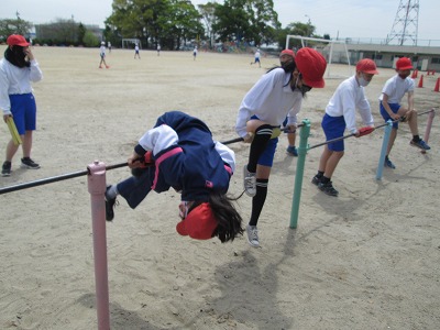 体育の時間では、鉄棒に取り組んでいます。逆上がりやかかえ込み回りの基本的な技から、前方支持回転や片膝掛け回転などの発展技にも挑戦しています。鉄棒は苦手と感じている子が多く、「一つもできない・・・」と言いながらも、上手にできる子にこつを聞いたり、補助板を使ったりしてして練習に励んでいます。