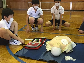 そしてAEDの操作方法を4,5人ずつに分かれて取り組みました。