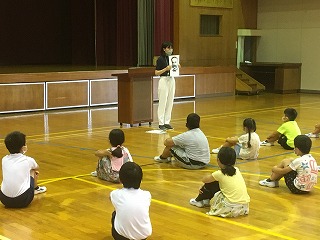 社会的距離をとったうえで、全校児童が体育館に集まりました。