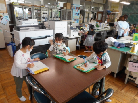 1年生の教室と違うものや教室にはないものを見つけて、たくさんカードにかいていました。