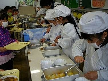 食器にご飯やカレー、フルーツポンチをつけ分けます。