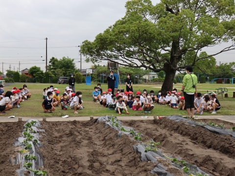 まずは、みんなでサツマイモ苗の植え方の説明を聞きました。