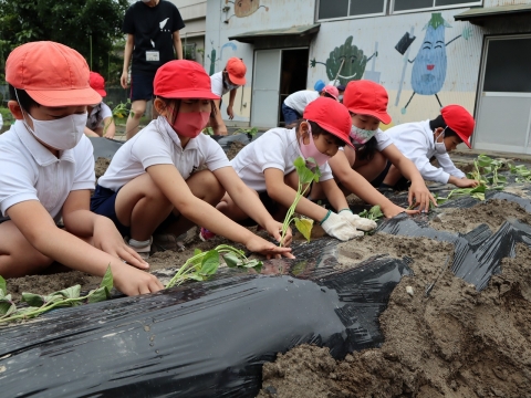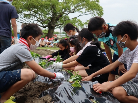 田植えから戻って、今度は「ハピスマ班」ごとに、サツマイモの苗植えをしました。
