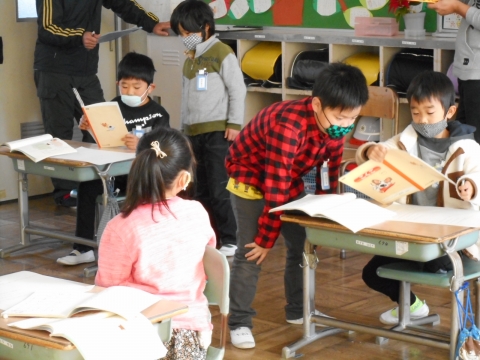 1年生は『むかしばなしを よもう』の単元で、教科書の昔話を勉強した後に、いろいろな昔話を各自で読みました。