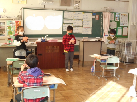 友達が読んだ昔話の面白かったところをインタビューしてプリントにまとめ、感想カードを書いて発表しました。