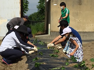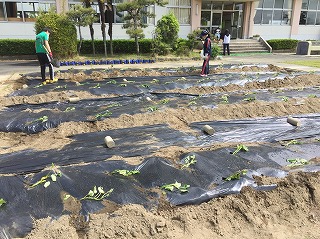 昨日作ったうねに、サツマイモの苗を植えました。