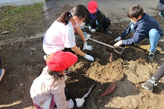 校内の畑で栽培していたサツマイモを掘りました。