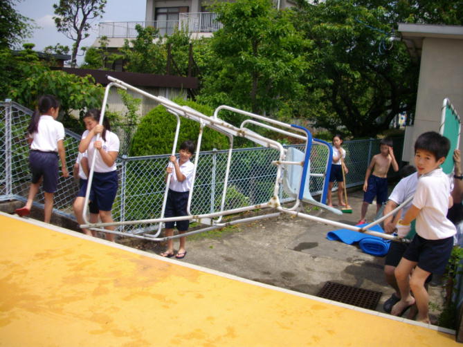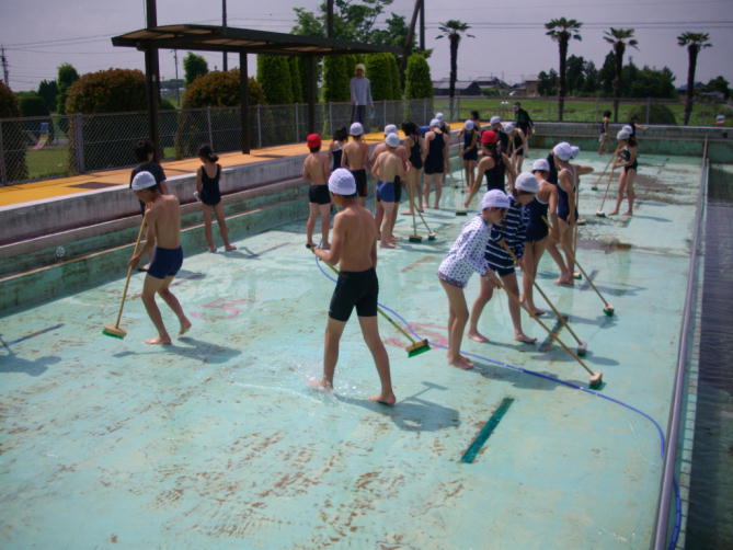 6年生はデッキブラシをもって颯爽とプールへ、