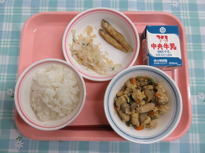 ごはん、牛乳、高野豆腐の卵とじ、わかさぎの唐揚げ、大葉の香り和え