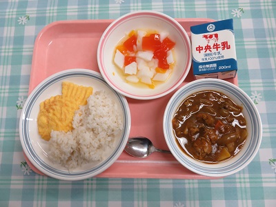 麦ごはん、牛乳、とわだカレー、鯛型オムレツ、トマトゼリーの紅白ポンチ