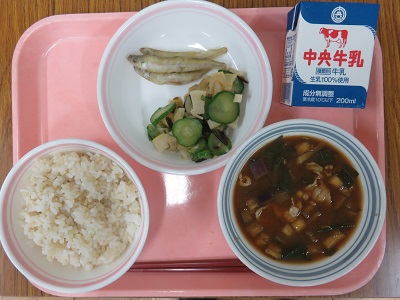 金芽ロウカット玄米ごはん、牛乳、わかさぎの唐揚げ、大葉入り塩昆布和え、夏野菜の豚汁