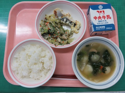 ごはん、牛乳、たらのみそクリームチーズ焼き、磯香和え、春のじゃがいも団子汁