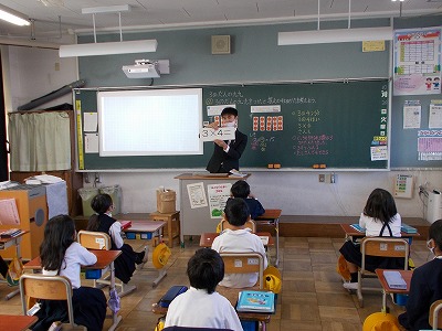 2年生の算数で、九九を使ってかけ算の文章題を解く授業を行いました。文章題の内容を数図ブロックの図に表して立式し、九九を使って答えを出すことができました。